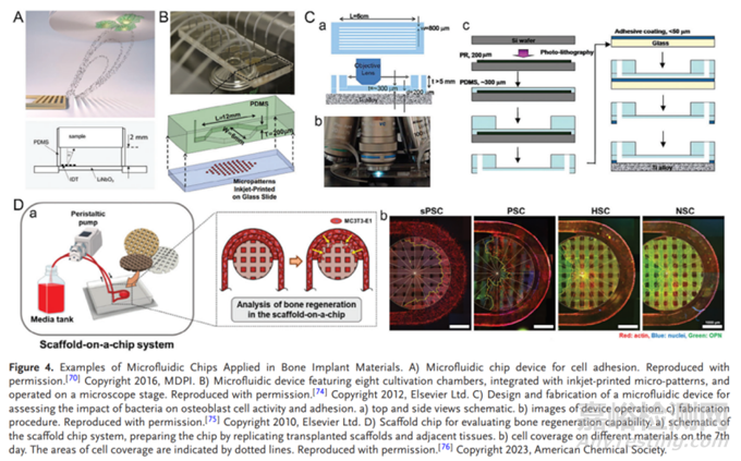 Andreas等設(shè)計(jì)了一個(gè)小型化(100 μL)的微流控芯片植入物系統(tǒng),通過激發(fā)表面聲波誘導(dǎo)微聲流產(chǎn)生剪切應(yīng)力,可在動(dòng)態(tài)條件下定量測(cè)量植入物材料表面的細(xì)胞粘附,可對(duì)不同的植入材料進(jìn)行動(dòng)態(tài)篩選。進(jìn)一步地,Sarah等開發(fā)了一種微流控平臺(tái)研究Ti6Al4V作為骨修復(fù)生物材料對(duì)MC3T3-E1成骨細(xì)胞的細(xì)胞活力、增殖等細(xì)胞行為的影響,結(jié)果表明動(dòng)態(tài)條件培養(yǎng)的細(xì)胞有更高的活力和更細(xì)長(zhǎng)形態(tài),但是芯片中的鈦樣品較難移出,使得評(píng)估細(xì)胞行為的標(biāo)準(zhǔn)生化檢測(cè)需要改進(jìn)。