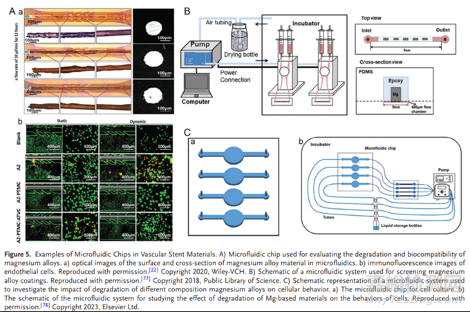 生理流體動(dòng)力學(xué)環(huán)境在細(xì)胞對(duì)可吸收支架降解行為的響應(yīng)中有至關(guān)重要的作用。為了更好地模擬血管支架與內(nèi)皮細(xì)胞和平滑肌細(xì)胞間的復(fù)雜動(dòng)態(tài)相互作用, Ye等設(shè)計(jì)開發(fā)了一種微流控芯片用于模擬早期鎂合金支架的血管微環(huán)境,研究鎂基支架的降解行為以及支架與內(nèi)皮細(xì)胞的相互作用。Shang等將植入血管支架的體內(nèi)環(huán)境簡(jiǎn)化為微流控系統(tǒng),研究了在接近生理流體條件下,剪切應(yīng)力對(duì)鎂基支架的降解的影響及支架的耐腐蝕性能。作者還將微流控系統(tǒng)與細(xì)胞培養(yǎng)芯片結(jié)合,評(píng)估了降解產(chǎn)物對(duì)血管細(xì)胞的影響。結(jié)果顯示,微流控系統(tǒng)與傳統(tǒng)浸泡試驗(yàn)和動(dòng)物實(shí)驗(yàn)的結(jié)果趨勢(shì)相同。