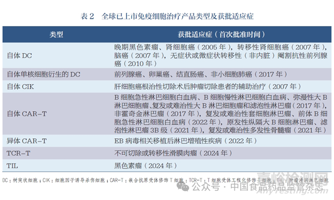 除目前已上市的CIK、CART、TILs、TCR-T 以及用于實體瘤治療的樹突狀細胞(dendritic cells, DC) 疫苗產(chǎn)品( 見表2)外,源于自然殺傷細胞(natural killer cell,NK) 和巨噬細胞的CAR-NK、CAR-M 等臨床研究也進展迅速。