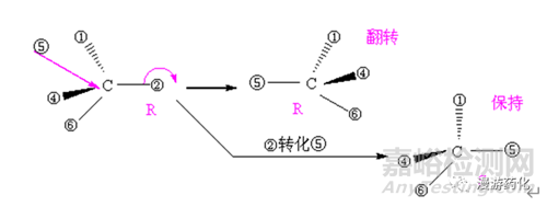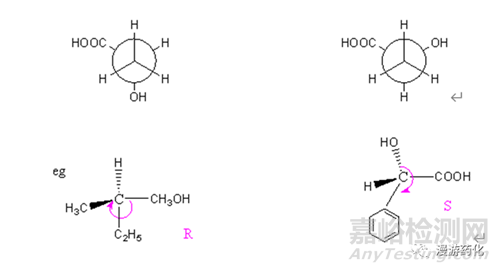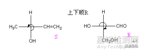 ● 次序最小的基團(tuán)處于橫線上時(shí),即在紙面前方。觀察者應(yīng)從紙后面往前看,因此,從另三個(gè)基團(tuán)判斷,如R應(yīng)改為S,如S應(yīng)改為R。