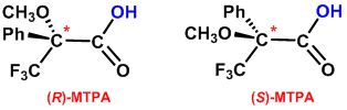 NMR 技術(shù)是獲的化合物結(jié)構(gòu)的首選方法,其耦合常數(shù)和NOE譜圖是獲取化合物相對(duì)構(gòu)型的重要手段,適用于剛性結(jié)構(gòu)非對(duì)映體的構(gòu)型確認(rèn)。但是對(duì)于光學(xué)(對(duì)映)異構(gòu)體而言,一般情況下其NMR譜的信號(hào)是相同的,即應(yīng)用NMR 譜無(wú)法直接將其區(qū)分,也不能確定其絕對(duì)構(gòu)型。近年來(lái)發(fā)展了一些間接方法,借助NMR法,通過(guò)手性樣品的衍生物來(lái)測(cè)定對(duì)映異構(gòu)體的絕對(duì)構(gòu)型。