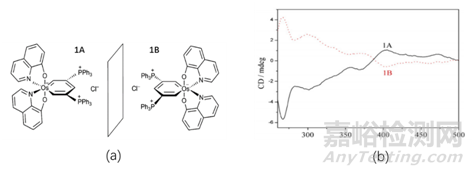 該方法主要是通過(guò)測(cè)定光學(xué)活性物質(zhì)(待測(cè)物)在圓偏振光下的Cotton效應(yīng),根據(jù)Cotton效應(yīng)的符號(hào)獲得藥物結(jié)構(gòu)中發(fā)色團(tuán)周圍環(huán)境的立體化學(xué)信息,并與一個(gè)絕對(duì)構(gòu)型已知的與待測(cè)藥物結(jié)構(gòu)相似化合物的Cotton效應(yīng)相比較,或者借助計(jì)算化學(xué)的方法,對(duì)比實(shí)驗(yàn)測(cè)值和理論計(jì)算值,即可能推導(dǎo)出待測(cè)物的絕對(duì)構(gòu)型。圖2為鋨雜苯手性化合物1A和1B的結(jié)構(gòu)及其CD譜圖。