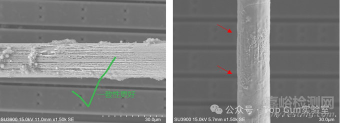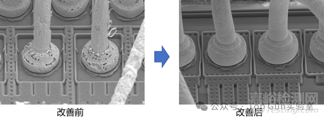 通過對開蓋后的樣品使用SEM檢查鍵合絲直徑和形貌,研究不同配方下銅線鍵合樣品的開蓋效果。