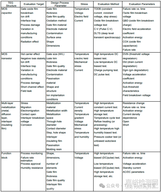 TEG評(píng)估以基本失效機(jī)制為目標(biāo)。在這種方法中,會(huì)專門制造一組器件,用于對(duì)每種失效機(jī)制進(jìn)行評(píng)估和分析。該方法能夠?qū)κC(jī)制進(jìn)行詳細(xì)的評(píng)估和失效分析,在量化極限和加速能力方面非常有效。下表展示了一個(gè)TEG評(píng)估方法的示例。
