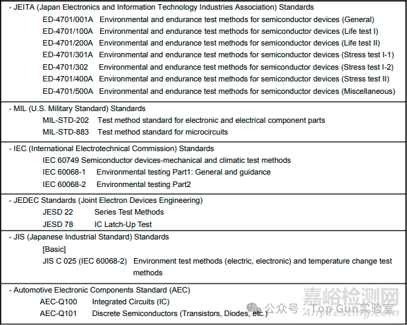 產(chǎn)品可靠性測試應(yīng)盡可能在實(shí)際的現(xiàn)場環(huán)境條件下進(jìn)行,并且始終要具備可重復(fù)性。因此,在可能的情況下應(yīng)選擇標(biāo)準(zhǔn)化的測試方法,要求測試符合日本工業(yè)標(biāo)準(zhǔn)(JIS)、日本電子信息技術(shù)產(chǎn)業(yè)協(xié)會(huì)(JEITA)、美國軍用標(biāo)準(zhǔn)(MIL)、國際電工委員會(huì)(IEC)和美國電子器件工程聯(lián)合委員會(huì)(JEDEC)等半導(dǎo)體器件測試標(biāo)準(zhǔn),下表展示了部分此類標(biāo)準(zhǔn)。