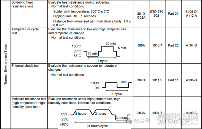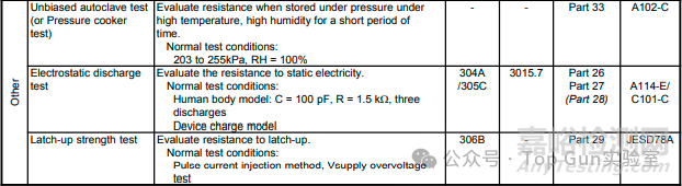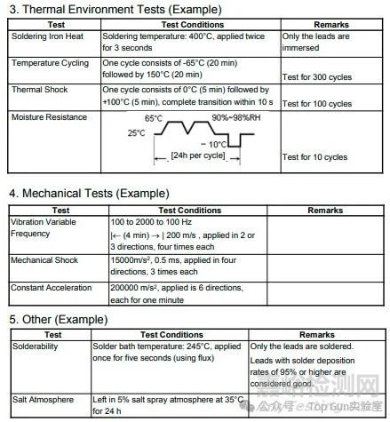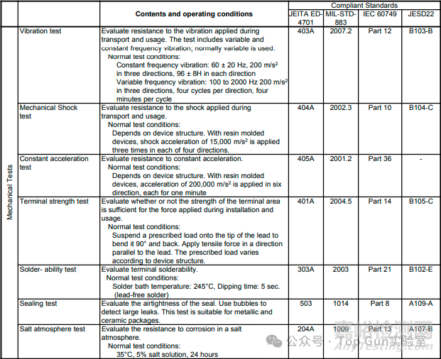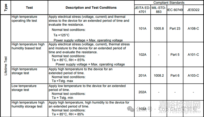 各公司可以從半導(dǎo)體產(chǎn)品的常見測試中(詳見下表),選取符合JIS、JEITA、MIL、IEC和JEDEC的測試方法,將其標(biāo)準(zhǔn)化、本地化,并依據(jù)產(chǎn)品組開展合適的測試。此外,還會(huì)在現(xiàn)場環(huán)境和氣候條件下進(jìn)行靜電放電(ESD)、閂鎖強(qiáng)度、軟失效等情況的測試。