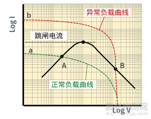 如下圖所示,跳閘電流上限以上的電流區(qū)域稱為跳閘電流區(qū)域,下限以下的電流范圍稱為保持電流區(qū)域,上下限之間的電流區(qū)域稱為保護(hù)電流變動(dòng)范圍。