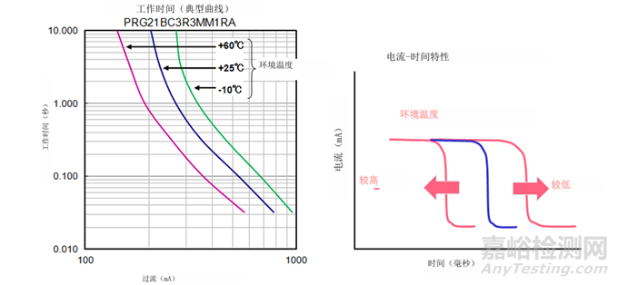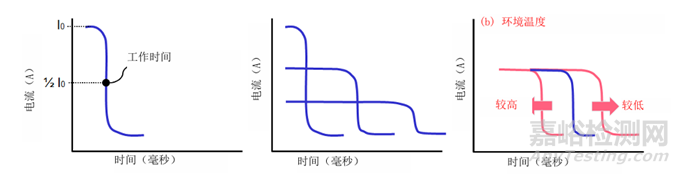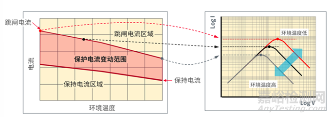 保持電流和跳閘電流取決于溫度,電流值隨著溫度升高而降低。