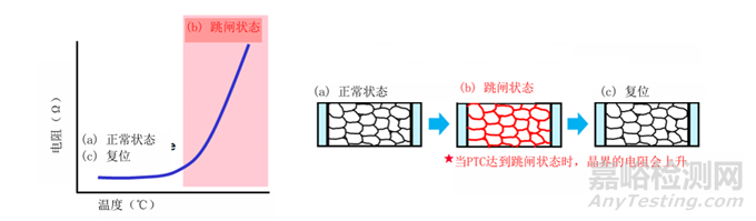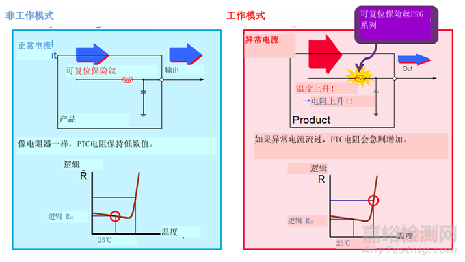 正常工作期間PTC電阻值穩(wěn)定。而且,當(dāng)過(guò)電流流向電路系統(tǒng)時(shí),器件溫度開(kāi)始迅速升高,PTC電阻由于電流通過(guò)而呈指數(shù)增加。