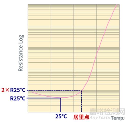 居里溫度(C.P.)即阻值為25°C時(shí)的阻值的兩倍時(shí)所對(duì)應(yīng)的溫度,如下圖所示: