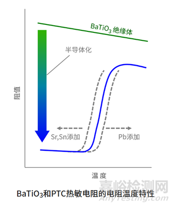 陶瓷PTC的主要材料是鈦酸鋇(BaTiO3),當(dāng)添加少量添加少量稀土元素( Y、Bi、Sb等)時(shí),其溫度特性與居里點(diǎn)相對(duì)應(yīng),如下圖所示: