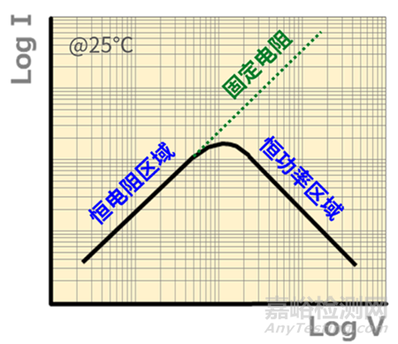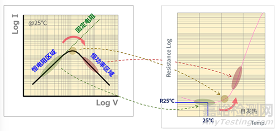 恒電阻區(qū)域內(nèi)V = IR關(guān)系成立,PTC熱敏電阻無(wú)自發(fā)熱。如圖所示PTC熱敏電阻還擁有最大電流點(diǎn)和恒功率區(qū)域兩個(gè)參數(shù)。
