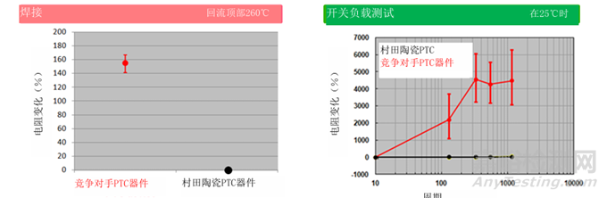 因此,PTC器件在焊接和開(kāi)關(guān)負(fù)載測(cè)試后的電阻變化很小,這個(gè)特性特性確保了電路的可靠性,這也是衡量不同品牌PTC可靠性的重要指標(biāo)。
