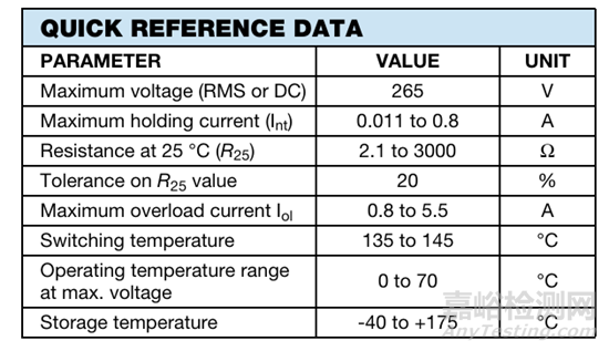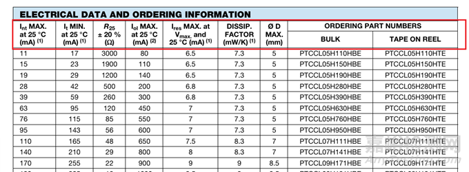 除了以上PTC的電氣特性和特征,我們?cè)谝渤R?guī)PTC的數(shù)據(jù)手冊(cè)中還有一些參數(shù)需要我們識(shí)別,下面我們將以某一品牌的PTC對(duì)一些重要參數(shù)進(jìn)行介紹: