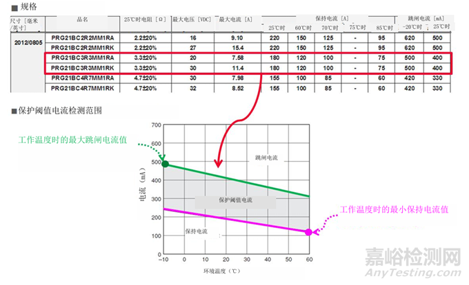 保持電流值和跳閘電流值之間的差別用灰色表示。此區(qū)域表明PTC器件可以跳閘或正常工作。