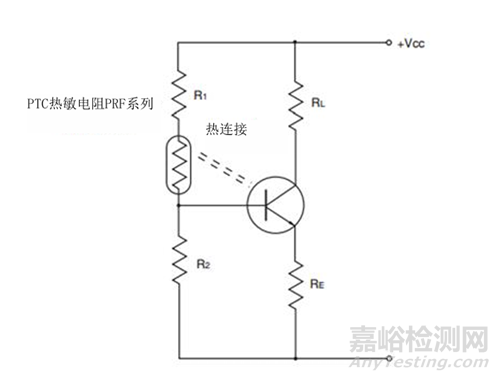 當(dāng)三極管超過(guò)一定溫度時(shí),PTC電阻瞬速增大,三極管截止。