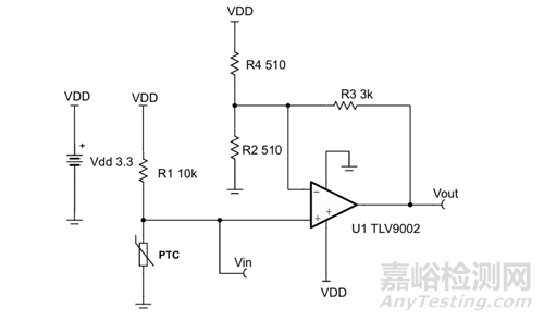 異常溫度發(fā)生時(shí),PTC會(huì)很快發(fā)熱達(dá)到開(kāi)關(guān)溫度,阻值會(huì)高于Rs ,比較器輸出高電平。