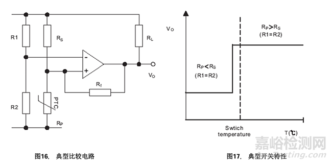 PTC熱敏電阻安裝于比較電路(如圖16)的其中一支腳。PTC的電阻值Rp在正常溫度低于Rs,所以比較器輸出低電平。