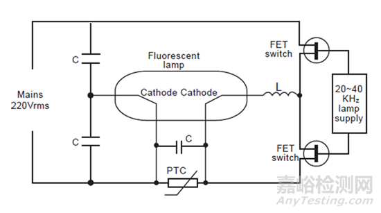 在整流線路啟動(dòng)時(shí),PTC熱敏電阻處于低電阻狀態(tài),燈管因電壓不足而不會(huì)被點(diǎn)亮。