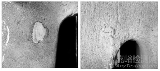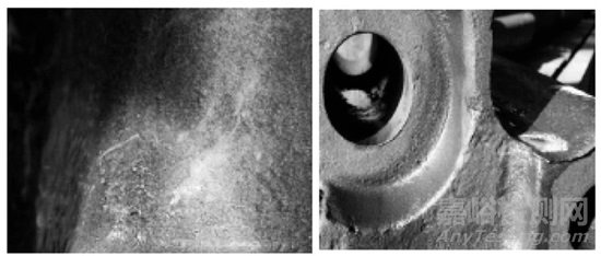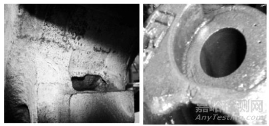 如側(cè)架漏水孔周邊裂紋、側(cè)架立柱磨耗板處裂紋磁痕等,這類(lèi)裂紋缺陷不能報(bào)廢處理,應(yīng)進(jìn)行返修,如圖4所示。