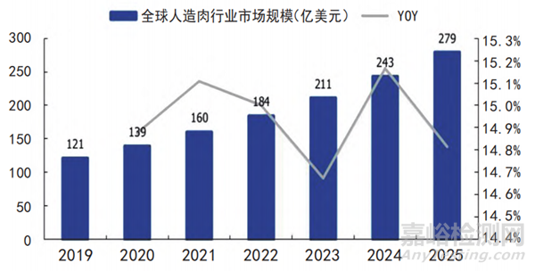 圖2:全球人造肉行業(yè)市場規(guī)模預(yù)測及增速