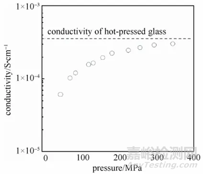 不同于氧化物陶瓷電解質(zhì)的高溫?zé)Y(jié)以制備致密樣品,玻璃態(tài)硫化物或玻璃陶瓷硫化物通過一定壓強的冷壓或較低溫度的燒結(jié),就可獲得電導(dǎo)率和體相電導(dǎo)率相近的片狀樣品。圖3所示 ,為75Li2S·25P2S5玻璃態(tài)電解質(zhì)的離子電導(dǎo)率和模具壓力的關(guān)系,電導(dǎo)率隨著模具壓力的增加而增大,當(dāng)壓力達(dá)到360MPa時基本與熱壓得到的體相電導(dǎo)率接近。