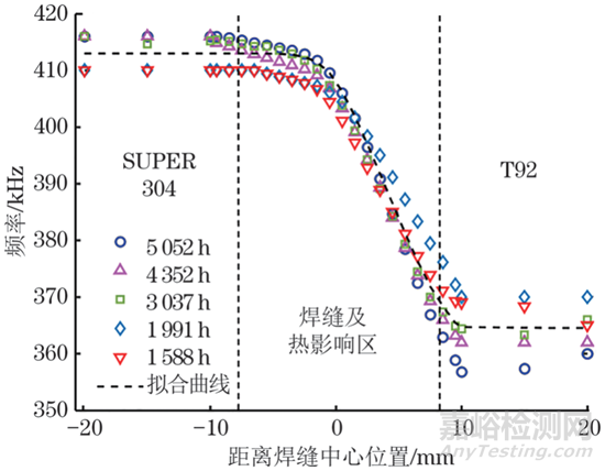其余熱老化試件的掃頻結果與圖3類似,此處不再贅述。此外,圖中3個不同區(qū)域的渦流敏感頻率不同,故提取每個檢測位置的渦流幅值比參量最大值處對應的頻率,繪制不同試件的最佳頻率隨掃描位置的變化曲線,如圖4所示,可見SUPER304母材區(qū)、焊縫過渡區(qū)和T92母材區(qū)的最佳敏感頻率不同。