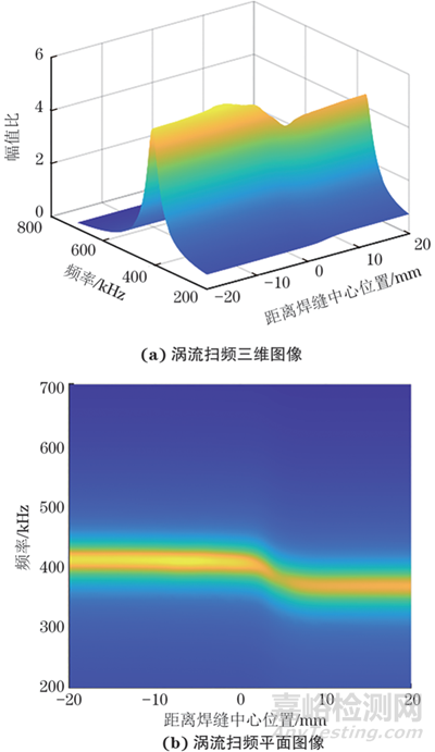 熱老化時間為1587 h的1#試件的渦流掃頻云圖如圖3所示,可知渦流幅值比在350~430 kHz范圍內(nèi)(黃色亮帶處)存在最大值,分析每個掃頻位置,發(fā)現(xiàn)渦流幅值比特征參量隨激勵頻率增加均呈現(xiàn)先上升后下降的趨勢。