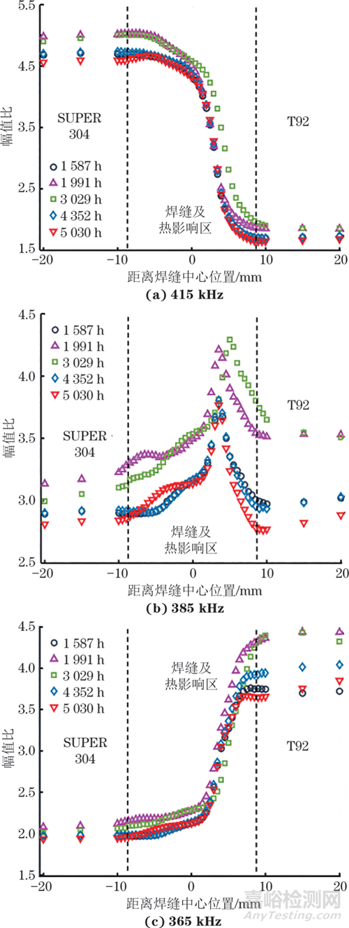 當激勵頻率為415 kHz時,SUPER304區(qū)的渦流幅值大于T92區(qū),焊縫過渡區(qū)的呈現(xiàn)遞減的變化趨勢。當激勵頻率降低至365 kHz時,不同熱老化試件的渦流幅值比參量隨檢測位置的變化趨勢與激勵頻率為415 kHz時的相反。當激勵頻率為385 kHz時,焊縫過渡區(qū)中心位置的渦流幅值比參量存在最大值,并逐漸沿兩個母材區(qū)位置遞減,整體上看,SUPER304區(qū)的渦流幅值比參量略低于T92母材區(qū)。