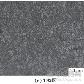SUPER304/T92焊接試件熱老化保持時間為1587 h時焊接接口不同區(qū)域的金相組織圖像如圖6所示,可以看出SUPER304區(qū)域為均勻的奧氏體等軸晶,焊縫區(qū)域為粗大的鐵素體柱狀晶和少量球狀珠光體,T92母材區(qū)域的微觀組織則為回火馬氏體,且保持了板條馬氏體的形態(tài)特征。