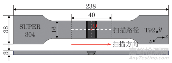 選取5個初始狀態(tài)相同的SUPER304/T92異種鋼焊接標準拉伸試件作為檢測試件,每個試件均由SUPER304和T92兩種材料焊接制成,因此試件可分為3個區(qū)域:SUPER304區(qū)、焊縫過渡區(qū)和T92區(qū),如圖2所示。