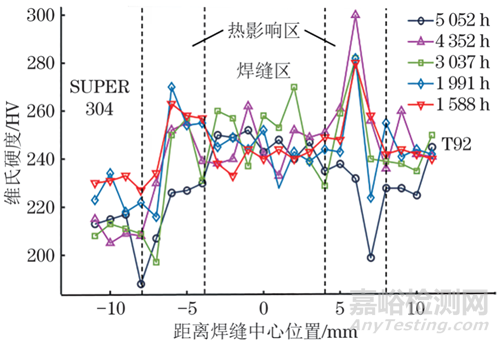 總體來看,隨著熱老化處理時間的增加,SUPER304區(qū)和T92區(qū)均存在軟化的趨勢。焊縫區(qū)域的硬度基本保持穩(wěn)定。