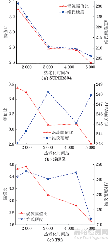 3、SUPER304、焊縫及T92區(qū)的渦流幅值比均隨著熱老化時間的增加而減小。采用Spearman秩相關系數(shù)對渦流和硬度的相關性進行定量分析,發(fā)現(xiàn)SUPER304區(qū)及焊縫區(qū)的渦流與硬度具有良好的相關性(|ρ|≥0.90),T92區(qū)的渦流與硬度之間的相關性則較弱(|ρ|=0.70)。