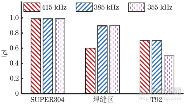 2、由于SUPER304、焊縫及T92區(qū)分別由奧氏體、鐵素體及珠光體混合物、馬氏體組成,各區(qū)域材料對應的電磁特性不同,因此渦流幅值比參量也不同。
