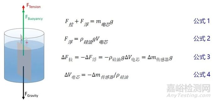 原位產(chǎn)氣體積監(jiān)控儀主要基于牛頓定理和阿基米德浮力定律,通過高精度力學測量儀實時測得樣品的體積變化量,測試原理如下所示。