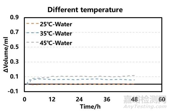 本文采用原位產(chǎn)氣體積監(jiān)控儀(GVM2200)表征了去離子水以及硅基漿料在不同溫度下的產(chǎn)氣體積變化。隨溫度的升高,去離子水的體積在新的溫度環(huán)境下達到熱平衡后,幾乎不發(fā)生變化,而硅基漿料隨擱置時間進行,產(chǎn)氣體積逐漸增加,原位產(chǎn)氣體積監(jiān)控儀(GVM2200)可精準測量出該過程的體積變化量,可實現(xiàn)產(chǎn)氣量的連續(xù)化自動測試,為材料研發(fā)和漿料產(chǎn)氣機理研究提供有力的技術(shù)支持。