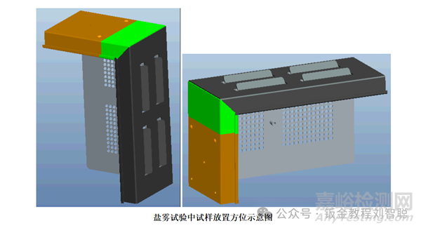 被測樣件應(yīng)在批量產(chǎn)品中抽取,原則是:在每種基材、每種噴涂前處理及噴涂工藝、每種涂層顏色及紋理的產(chǎn)品中分別抽取1件,機(jī)柜類形(包括盒式)的產(chǎn)品抽取門板、壓鑄模塊類產(chǎn)品缺抽取外殼前蓋。如果門板零件太大放不進(jìn)試驗(yàn)箱,則允許截取門板一角進(jìn)行試驗(yàn),截取大小以能夠放進(jìn)試驗(yàn)箱為限、且所截取的部分必須包括鉸鏈部位;切割邊允許用涂漆、封蠟等類似方式進(jìn)行包覆保護(hù)處理,保護(hù)材料顏色需要明顯區(qū)別于原始涂層,試驗(yàn)后切割邊附近10mm距離內(nèi)的現(xiàn)象不計(jì)入試驗(yàn)結(jié)論。