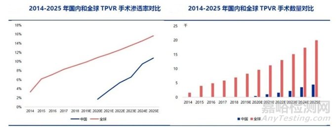 國(guó)內(nèi)TPVR手術(shù)數(shù)量將從2020年的約400例增加到2025年的4400例,對(duì)應(yīng)五年復(fù)合增速為61% ,同期滲透率將達(dá)到10.8%。同全球相比較而言,我國(guó)TPVR的滲透率低于全球水平,但爆發(fā)時(shí)間點(diǎn)將從2020年開(kāi)始,且增速明顯快于全球。