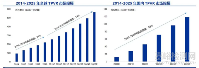 考慮到不斷增長(zhǎng)的TPVR手術(shù)數(shù)量,預(yù)計(jì)全球TPVR市場(chǎng)規(guī)模在經(jīng)歷了2014-2018年復(fù)合增速的24%之后,2018-2025年的復(fù)合增長(zhǎng)率將會(huì)放緩至14% ,到2025年為5億多美元;國(guó)內(nèi)的TPVR市場(chǎng)則將從2020年的約1200萬(wàn)美元增長(zhǎng)到2025年的1.19億美元,對(duì)應(yīng)年復(fù)合增速為58%。