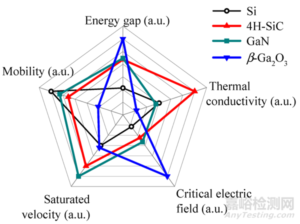 圖2:Si、4H-SiC、GaN和β-Ga2O3基本材料特性的雷達圖,所有參數(shù)均已規(guī)范化。(來源:MDPI)