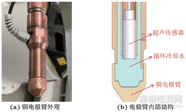 針對上述問題,筆者開發(fā)了內(nèi)嵌超聲傳感器的水冷電極臂,實現(xiàn)電阻點焊質(zhì)量原位在線監(jiān)測,研究超聲數(shù)據(jù)特征與虛焊缺陷、焊核直徑的關(guān)系。