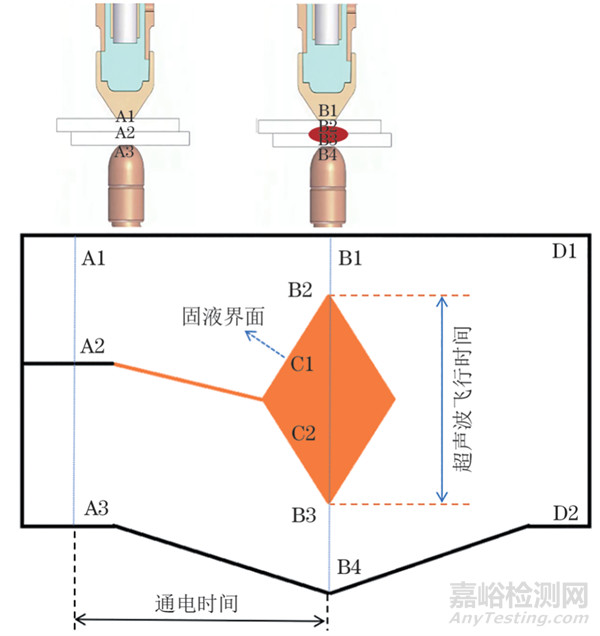 在焊核熔化和凝固過程中,超聲原位監(jiān)測系統(tǒng)實時監(jiān)測固液界面位置,進(jìn)而檢測熔核厚度,并利用熔核厚度計算熔核直徑。