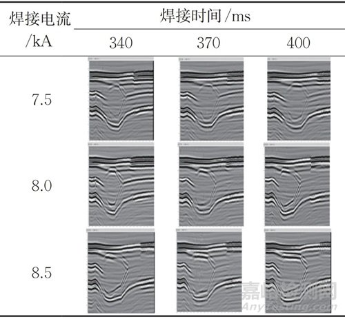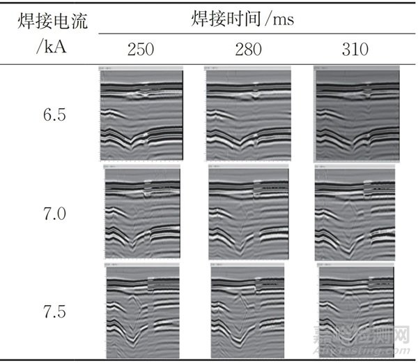 由表1可以看出,在焊接電流較?。?.5 kA)時,隨著焊接時間的增加,難以實現(xiàn)有效形核。在焊接電流為7 kA時,焊接時間較短時形核較小,但隨著焊接時間增加,菱形超聲B掃特征區(qū)域逐漸增大。即最小焊接有效電流為7 kA。在焊接電流為7.5 kA時,即便很短的焊接時間,也可以有效形核,隨著焊接時間的增加,焊核尺寸會逐步增大,對應(yīng)的超聲波飛行時間也變大。