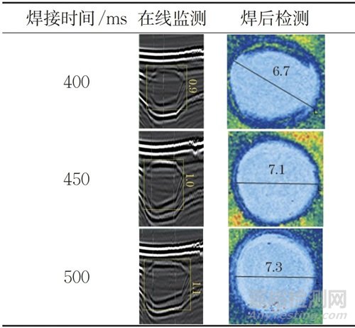 在線監(jiān)測和焊后檢測結(jié)果比較如表3所示,可以看出,在焊接電流和電極壓力不變(8.0 kA和3.4 kN)條件下,隨焊接時間增加(400,450,500 ms),在線監(jiān)測菱形特征區(qū)尺寸和焊后C掃描圖像中的熔核直徑都會增大,據(jù)此可以通過在線監(jiān)測菱形特征區(qū)尺寸來預(yù)測焊點熔核直徑。