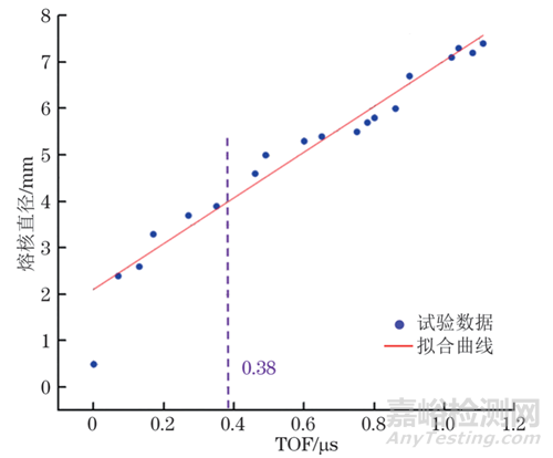 汽車領(lǐng)域標(biāo)準(zhǔn)要求板厚為3 mm搭接接頭熔核直徑的合格值為不低于4 mm。由熔核直徑與TOF擬合結(jié)果得知,TOF時間與焊核直徑具有較好的線性關(guān)系,4 mm直徑對應(yīng)TOF時間為0.38 μs。