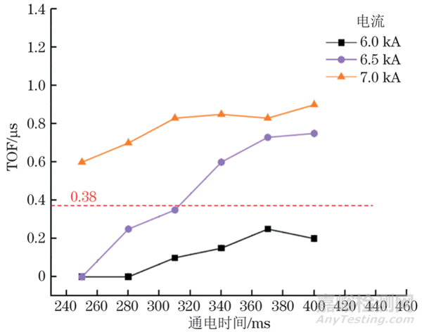 筆者統(tǒng)計了TOF時間與焊接參數(shù)(焊接電流和通電時間)之間的關(guān)系,其對比結(jié)果如圖7和圖8所示,據(jù)此可以給出合理的工藝參數(shù)區(qū)間范圍,例如,當(dāng)TOF值小于0.38 μs時,無法獲得有效熔核直徑。且低于有效電流時,均有未熔合缺陷產(chǎn)生,高于有效電流時,熔核質(zhì)量都滿足標(biāo)準(zhǔn)。