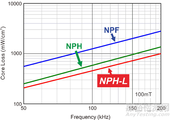 選擇合適的磁芯,要考慮不同的B-H曲線和頻率特性,因?yàn)锽-H曲線決定了電感的高頻損耗,飽和曲線及電感量。因?yàn)闇u流一方面引起電阻損耗,導(dǎo)致磁材料發(fā)熱,并引起激磁電流加大,另一方面減少磁芯有效導(dǎo)磁面積。所以盡量選擇電阻率高的磁性材料或采用碾軋成帶料的形式以減少渦流損耗。因此,鉑科新材料NPH-L適用于更高頻率、高功率器件的低損耗金屬粉芯。如圖所示: