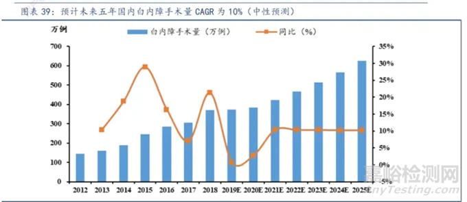 根據(jù)弗若斯特沙利文預(yù)測,2021年中國人工晶體市場規(guī)模42億元,2030年預(yù)測為98億元。據(jù)弗若斯特沙利文預(yù)測,中國白內(nèi)障手術(shù)量將從2019年的430萬例增長至2030年的1140萬例,復(fù)合增速為9.3%。