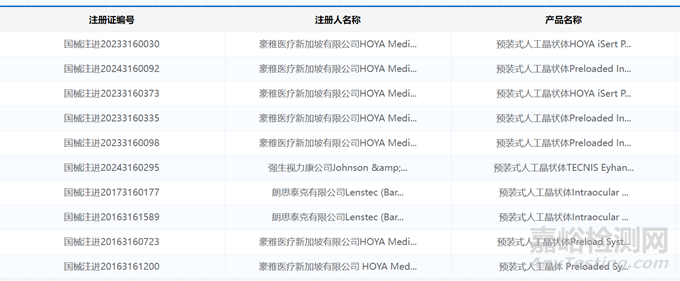 部分已獲批的進口預(yù)裝式人工晶狀體系統(tǒng)