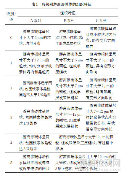三個(gè)系列滲碳體的級(jí)別劃分原則如下:A系列的滲碳體呈網(wǎng)狀,根據(jù)個(gè)別鐵素體晶粒外圍被滲碳體網(wǎng)包圍部分的占比及滲碳體網(wǎng)的完整程度評(píng)定;B系列的滲碳體呈鏈狀分布,有單層、雙層或多層的鏈狀,根據(jù)游離滲碳體顆粒的大小和鏈狀層數(shù)目及鏈狀的長(zhǎng)度進(jìn)行評(píng)定;C系列的滲碳體呈點(diǎn)狀,根據(jù)點(diǎn)狀滲碳體顆粒的大小和滲碳體趨向帶狀分布的程度進(jìn)行評(píng)定,各級(jí)別滲碳體特征如表1所示(游離滲碳體尺寸最大,可通過(guò)目鏡或投影屏兩種方式測(cè)量)。